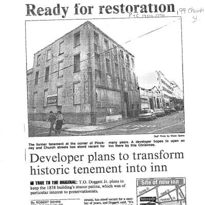 Three-and-a-half story tenement constructed in 1858 at the corner of Church Street and Pinckney Street. Renovated into an inn, Andrew Pinckney Inn. The stucco patina was to have been retained during the renovation. (May have been known previously as 41 Pinckney Street.)