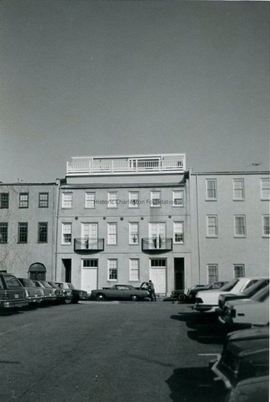 B&W photograph of 2-16 North Adger's Wharf, viewed from across a parking lot.Collection