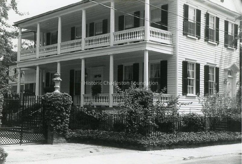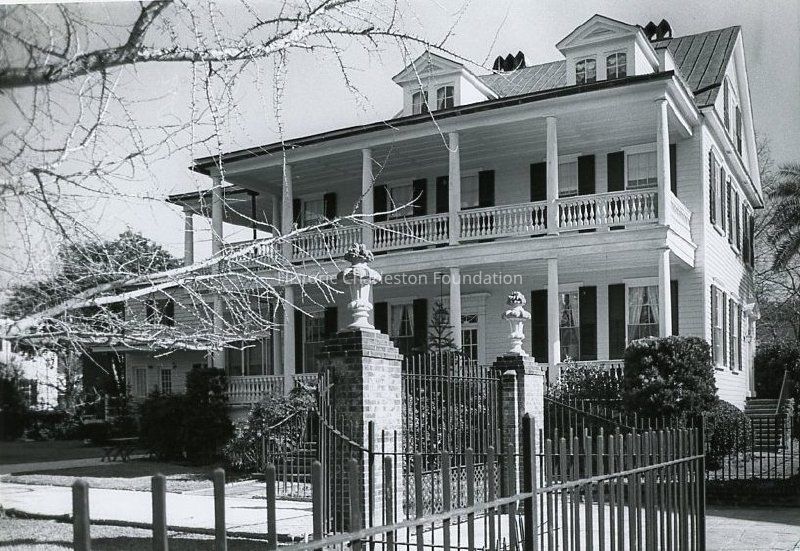 a: Corner view of the house, featuring the double-tiered piazzas on the west elevation. Iron fence and gate with brick gate posts in foreground.