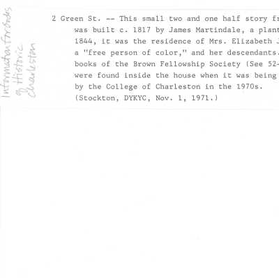 File contains narrative history from the book Gems in a Crown by Harry Lightsey; house history from Information for Guides of Historic Charleston; graduate student report (Lauren Cannady, 2009) on the history of the house, which includes historical and chain-of-title research, maps, photos, and other supporting documentation..Collection