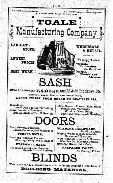 Building-and-supply company owned by the Toale family who lived at 90 Ashley Avenue in the 1880s. No additional building history on file. Needs further research.