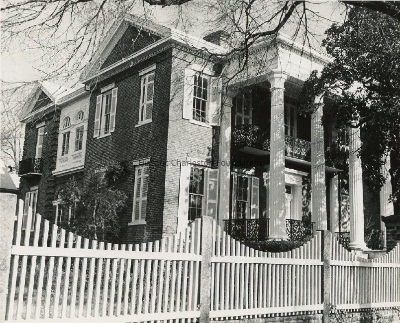 B&W photograph of 20 Charlotte Street (Joseph Aiken House), southwest corner of the building showing the front facade dominated by its columns. White picket fence in front of house in foreground.Collection