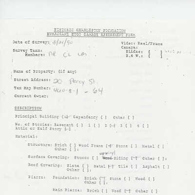 File contains graduate student report (Sada Stewart, 2017) on the history of the building/property, which includes historical and chain-of-title research, maps, photos, plats, and other supporting documentation; 1886 Earthquake damage assessment; Hurricane Hugo Damage Assessment Survey.Collection