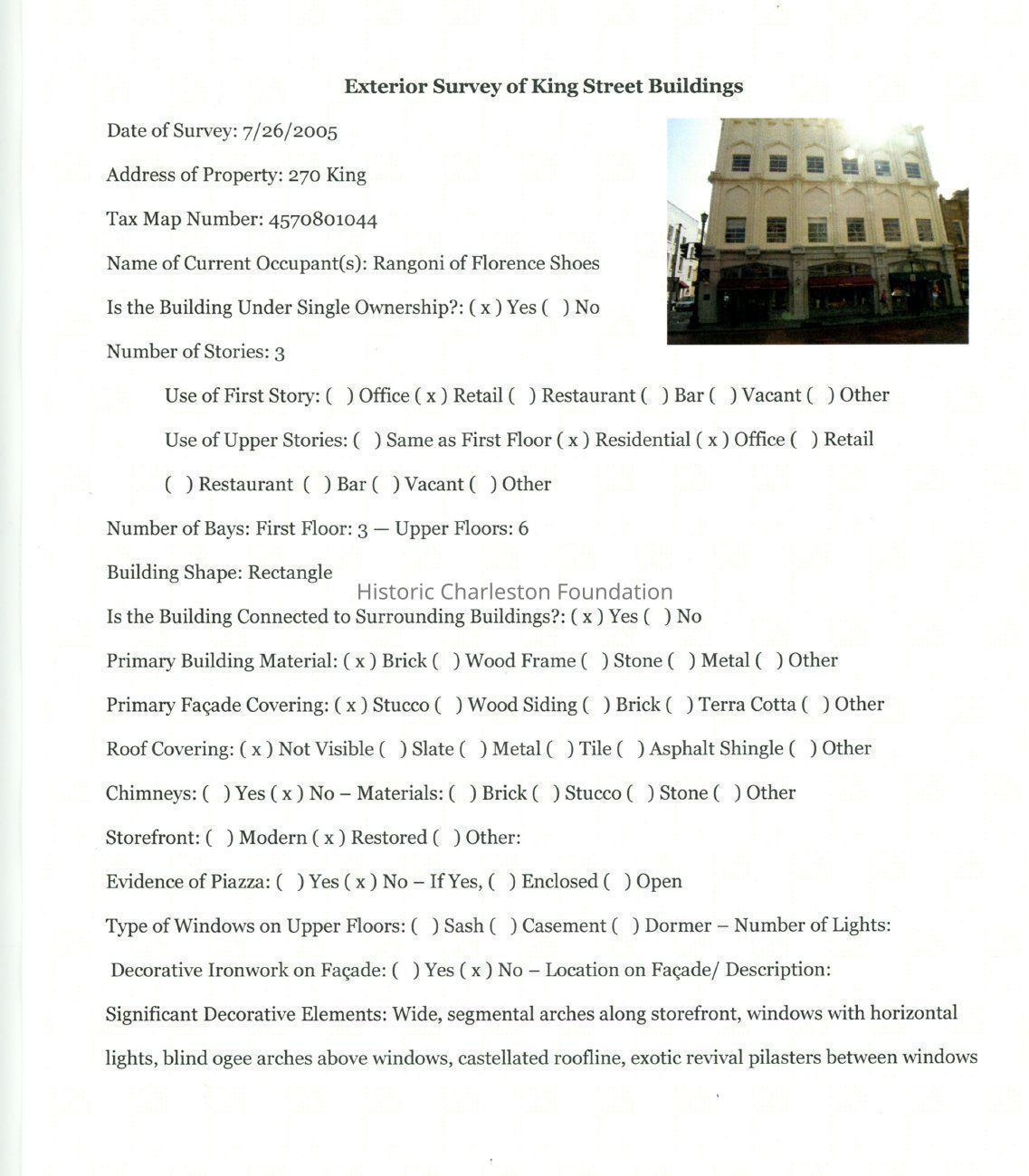 Architectural assessment and image survey of the exteriors of King Street buildings between Broad and Calhoun Streets, created by HCF interns in 2005. Arranged in numeric order by individual street address ranging from 114 King Street to 381 King Street. Each entry includes a survey form with a current photo of the building. Attached to each assessment form may be historical images (engravings, sketches, newspaper photos, etc.) that were obtained from the primary research institutions in Charleston including HCF Archives, South Carolina Historical Society, the South Carolina Room at the Charleston County Library, the College of Charleston Special Collections, the Gibbes Museum, the Charleston Museum, and the Preservation Society of Charleston; other images include were obtained online from the Historic American Buildings Survey, and Saint Louis University's database of earthquake photographs.