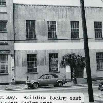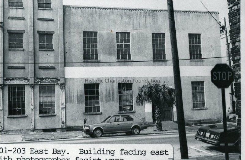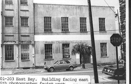 B&W photograph of 201-203 East Bay Street, front (east) elevation, taken from across the street at the corner East Bay and Cumberland Streets.Collection