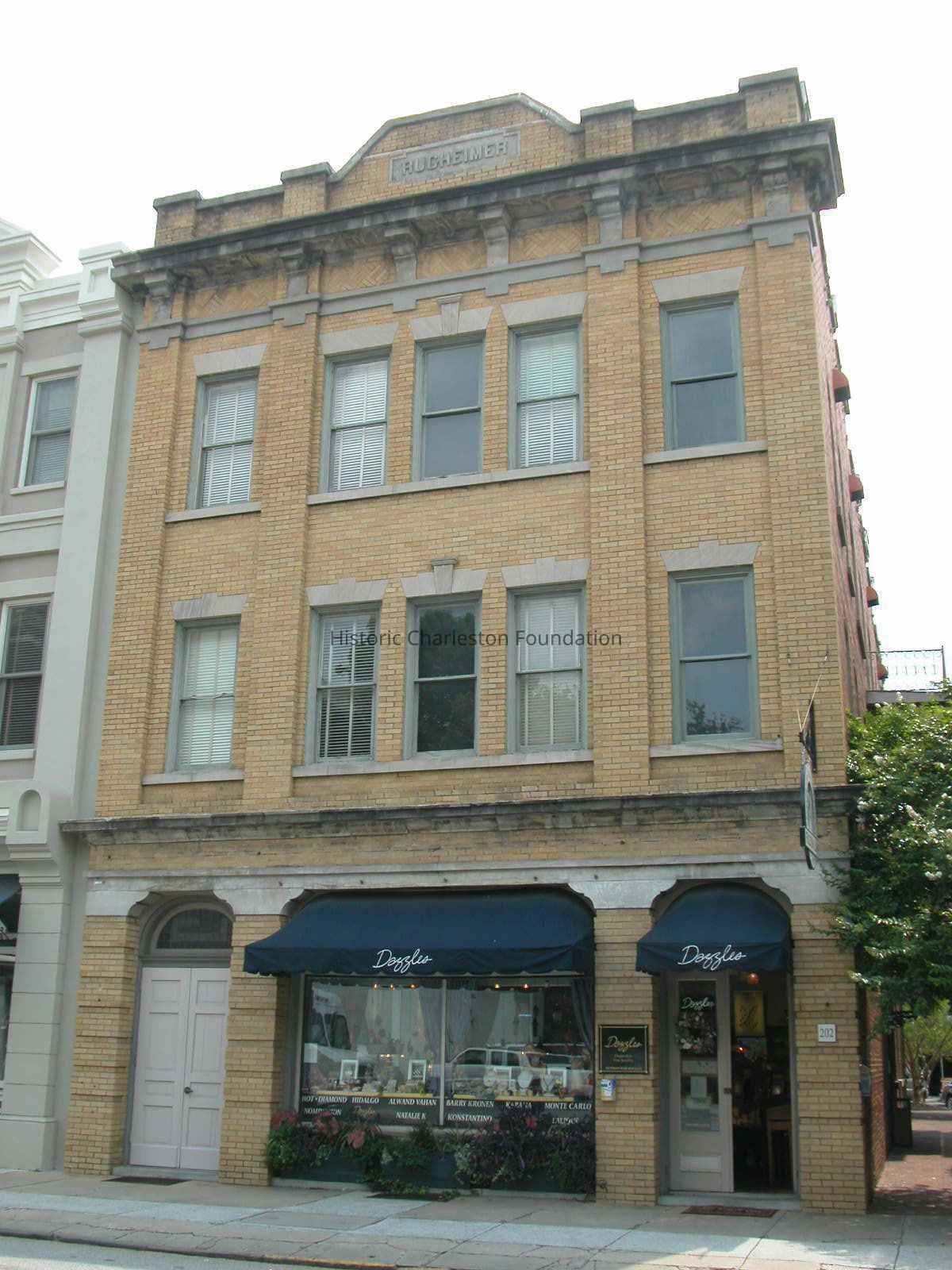 Constructed ca. 1912; rehabilitated 1980, 1992. Walker and Burden, architects. John Rugheimer, a German immigrant, settled in antebellum Charleston and, after a stint as a blockade runner, opened a tailor shop later at 169-171 King Street. After his death, his sons purchased this site in 1911, demolishing a 19th century structure except for the north common wall and building the 3-story brick edifice. The arched ground story with banded pilasters and bracketed granite capitals supports a yellow brick upper facade divided by brick pilasters topped by a granite entablature and a parapet with a panel designating the family name. The simpler south wall of red Philadelphia pressed brick has typical arched window openings of the early-20th century commercial type. When it was rehabilitated as an inn in 1992, the developers purchased the site next door, where a 2-story double building with a pressed-tin facade lost its entire facade to Hurricane Hugo. It was replaced with a 3-story masonry structure with reminiscent stucco detailing.