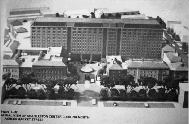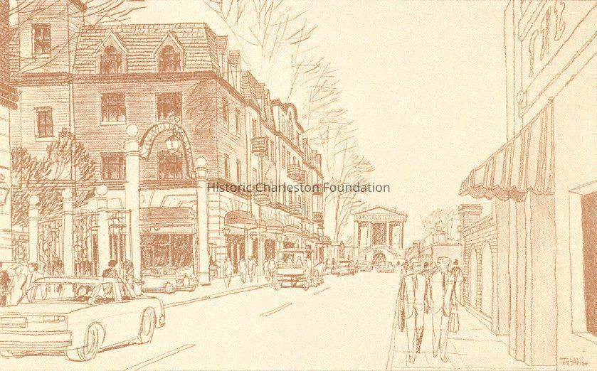 Charleston Place, constructed 1984-86. John Carl Warnecke and Partners, architects. Beginning in Mayor Palmer Gaillard's administration in the early 1970s, plans were formulated to rejuvenate King Street. This effort accelerated by 1975 and led Mayor Joseph P. Riley Jr. and city planners to attempt to lure a major hotel or convention center to a block bounded by Meeting, Hasell, King, and Market Streets. Although the city's intent was the renewal of the street, the issue sharply divided preservationists and the general citizenry. An early plan with a 10-story hotel tower of starkly contemporary design was shelved, and a compromise plan with a new developer and the Washington D.C., architect John Carl Warnecke was finally accepted in the early 1980s. The resulting complex features a hotel with restaurants and retail spaces along King and Market streets. The complex itself is a mix of Neo-Georgian/Second Empire style with synthetic green slate mansard roofs, varying textures and colors of brick, and rusticated cladding. A large gateway from Market Street with a forecourt provides an approach to the main hotel block, while the King Street side is dominated by interspersed curvilinear gables and square parapets with a clock tower, designed to hearken back to similar towers now lost from 273 and 275 King Street. Although preservationists considered retention of the facades of the buildings from 209 Meeting Street to 235 Meeting Street to be a major victory, the extensive rear sections of all these, primarily antebellum commercial structures, were removed to construct the hotel parking garage. These edifices include the Samuel Seyle building at 209 Meeting, built right after the fire of 1838 and sold by the fancy goods merchant, Gustav Sussdorf in 1859 to George S. Cameron. Cameron owned the three buildings to the north at 211, 213, 215 Meeting Street which have unified cast-iron facades consisting of Corinthian columns, modillions, and side brackets with human mask motifs, probably added just before or after the Civil War. These structures were gutted and several refaced after a fire in 1910, and the facade of the 2-story brick and cast-iron building at 213 Meeting was saved again after a 1979 fire by Historic Charleston Foundation under an easement agreement with the Hyams family, who had operated a dry goods business at 211 and 213 Meeting since the early part of the century. The five buildings to the north were owned before the Civil War by the Strohecker family and rented to a variety of brokerage houses. The Ansonborough entrepreneur Charles W. Seignious apparently owned the double-fronted edifice at 229 Meeting Street and fitted it out with Italianate style detailing. (Poston, Buildings of Charleston.)