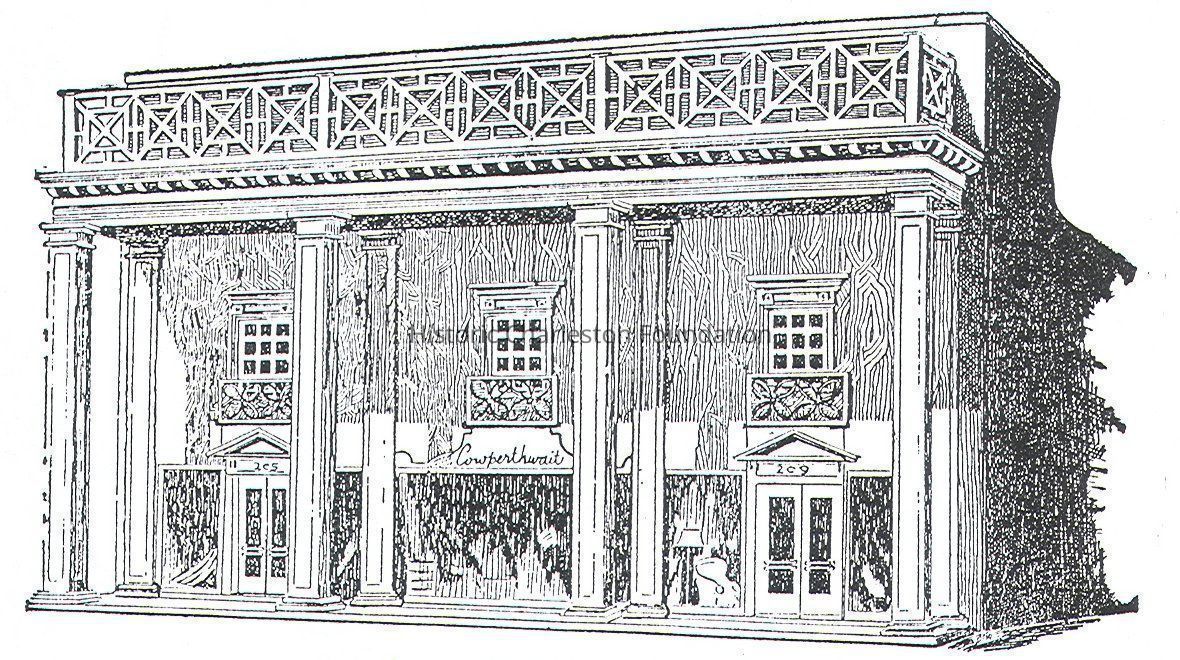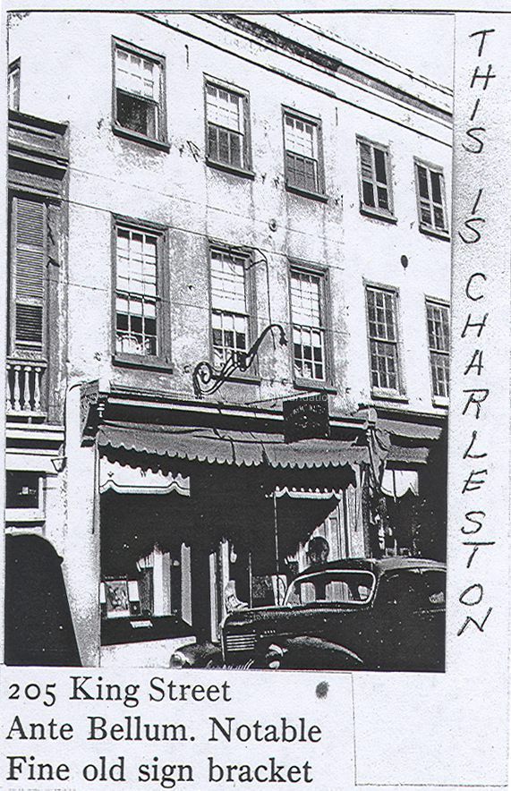 Early edition of This is Charleston describes 205 King Street as "Ante Bellum. Notable. Fine old sign bracket." 1990 edition lists it as "gone." Presumably, the original building at this site was replaced by one built in the 1940s that was operated as Cowperthwait Furniture Store. Needs further research.