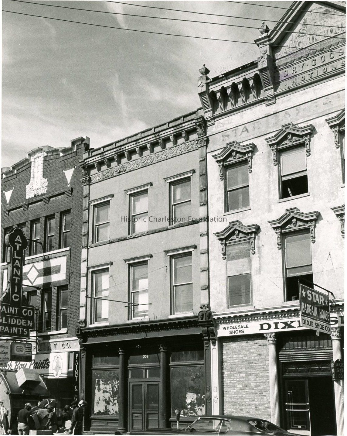 B&W photograph of 207-211 Meeting Street, front facades (east elevations), taken before 207 Meeting was demolished. Individual address shown are 207 Meeting (Atlantic Paint Company), 209 Meeting, and 211 Meeting (Dixie Shoe Company).Collection