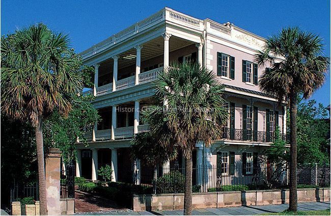 Constructed 1828; renovated 1838. This house was built in the Regency style by Charles Edmondston, a Scottish-born Charleston merchant, and remodeled by Charles Alston, a prominent rice planter, after he purchased the property in 1838. It reflects a modified Charleston single house plan with its front entry, accessing a separate vestibule on East Battery. Alston added a third tier with Corinthian columns to the side piazzas, a cast-iron balcony, and a surmounting parapet with the Alston coat of arms. Although changes were made to the exterior to accommodate Greek Revival fashion, the use of the structure most likely remained the same. Business visitors were received on the first floor, renovated in the Greek Revival manner by the Alstons; the drawing rooms on the second floor, where piazza doors could be thrown open to catch sea breezes or provide a backdrop for formal events, functioned as the family's social spaces and retain late Federal or Regency-style decoration. The two small rooms behind the drawing rooms served as separate withdrawing spaces for men and women, and the family bedrooms occupied the third floor. A substantial kitchen dependency is attached to the rear of the dwelling, while a separate stable and slave quarters remain at the back of the lot. Descending through Alston's daughter Susan Pringle Alston to her favorite cousin, the historian Henry Augustus Middleton Smith, the property has remained in the family. The house is currently shown as a museum administered by Middleton Place Foundation.