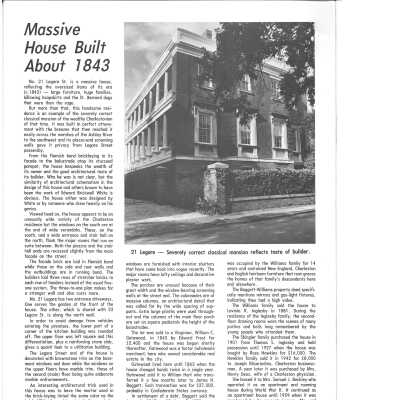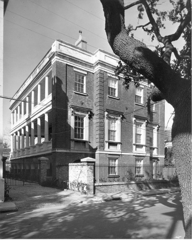 Constructed ca. 1843. Virginia-born William Gatewood, an important factor or export agent of sea-island cotton and rice, built this imposing structure. Ornamented by both brownstone details on the ground story and marble belt coursing and window architraves on the second, this brick facade with red-dyed mortar utilizes elements of Classical Revival and Greek Revival design. Piazzas, masked from the street by a fenestrated brick wall, present an imposing facade to the public way, thereby insuring privacy to the inhabitants as well as balancing the recessed stair tower on the other side. Large Tuscan columns support the piazzas, with paneled plinth bases on the second story matching the marble plinths under the window architraves. The drive to the north, formerly known as Sass's Alley, provided access to the brick kitchen and a circular drive, as well as to the substantial house at 23 Legare Street, owned in the 1840s by the well-to-do German craftsman Jacob Sass. (Poston, Buildings of Charleston.)