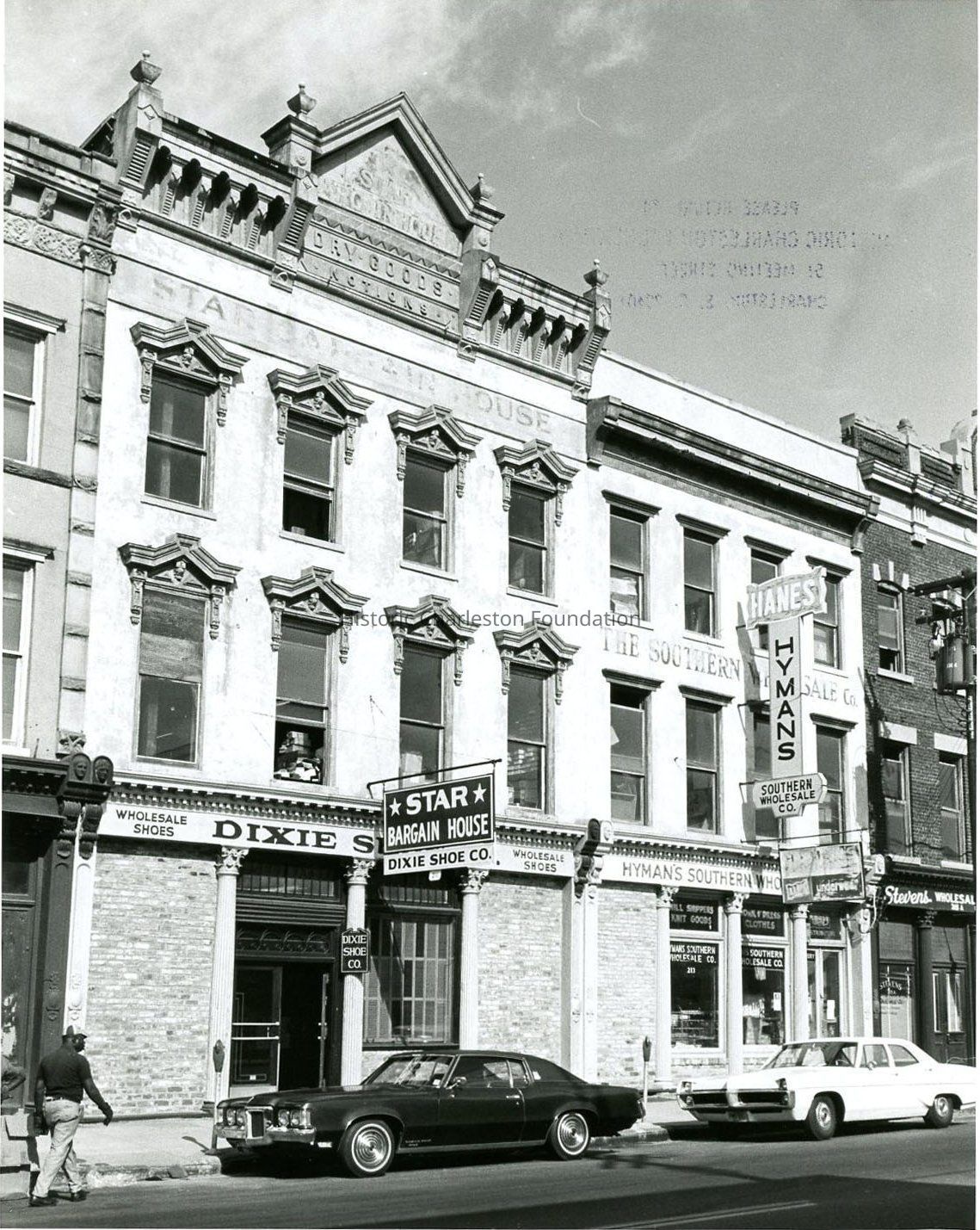 B&W photograph of 211 Meeting Street (Dixie Shoe Company) and 213 Meeting Street (Hyman's Southern Wholesale), front facade (east elevation). Cars parked in front of buildings.Collection