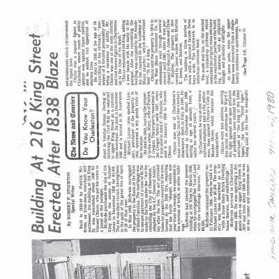 File contains newspaper article (1980 DYKYC); building history from Information for Guides of Historic Charleston (1984). (See Media link for building history from City of Charleston Tour Guide Training Manual (2011.)