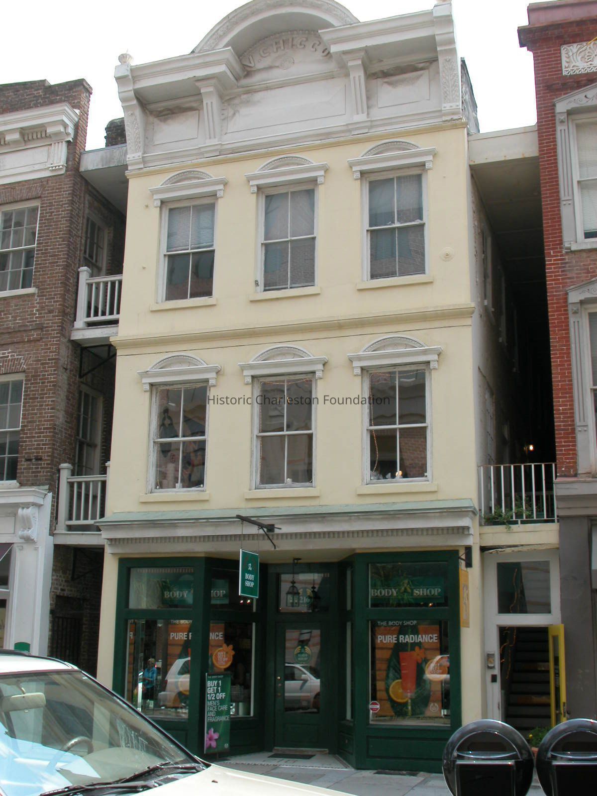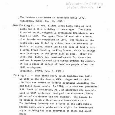 Constructed 1839-40; renovated and rehabilitated 1980s. Patrick McBride, a merchant and auctioneer who immigrated to Charleston from Ireland, constructed this 3-story masonry building after the fire of 1838. Sold in 1846 with a "three story brick dwelling house thereon and outbuildings," the property passed briefly through the hands of a dry goods merchant and became the property of Patrick Coogan for the rest of the century. Vincent Chicco, a colorful figure in early 20th century Charleston acquired the property in 1906. Known as the "king of the blind tigers," he was famous for his opposition to Prohibition laws. Chicco apparently added the pressed-metal decoration to the building, including the semicircular window hoods and bracketed entablature and arched parapet. After this work was complete, the building was occupied by the Academy Inn. In more recent years it was renovated and the facade was entirely removed and rebuilt, although the decorative elements were retained and replaced. The adjacent properties to the south, including the red pressed brick structure at 214 King Street and the site of 212 King Street, were owned by Henry Brown, a men's clothier, from 1888 until after the turn of the 20th century. In 1909 the Hampton Lee family, owners of Southern Furniture Company, constructed the 3-story gray brick building at 212 King Street, with its large windows and cast metal entablature over its first floor storefront.