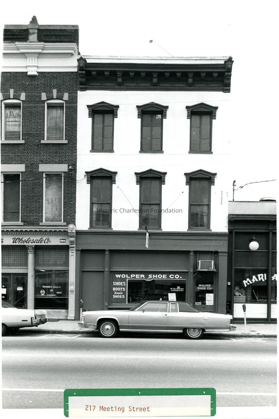 B&W photograph of 217 Meeting Street (Wolper Shoe Co.), front facade (east elevation). Car parked in front of the building.Collection