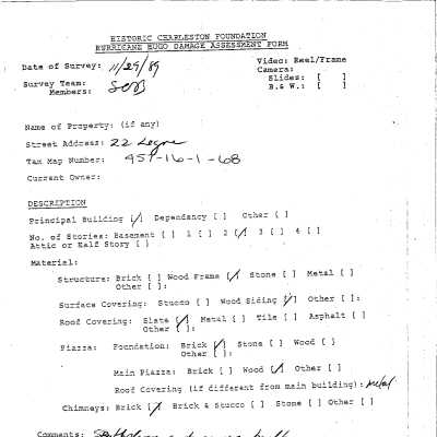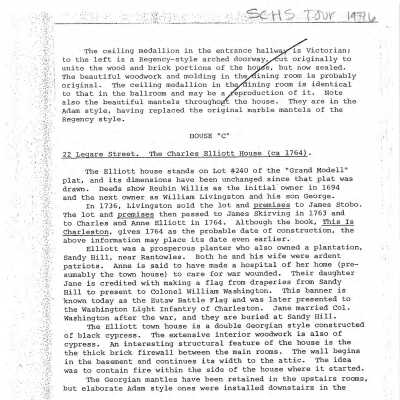 File contains SC Historical Society Tour house history (1976); newspaper article (DYKYC); biographical information about the Elliott family; photocopy of Grand Moddell; photocopy of plat showing lot of Charles Elliott; 1886 Earthquake damage assessment; Hurricane Hugo damage assessment survey (pdf).Collection