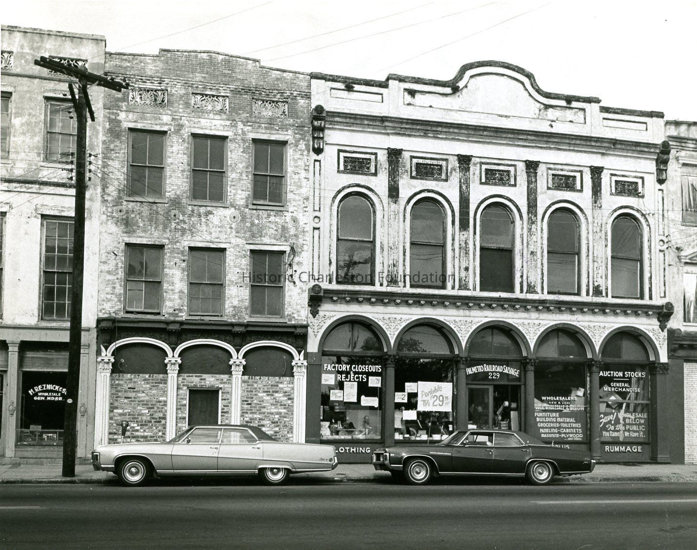 B&W photograph of 227 Meeting Street and 229 Meeting Street (Palmetto Railroad Salvage), east (front) elevation. Cars parked in front of buildings.Collection