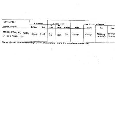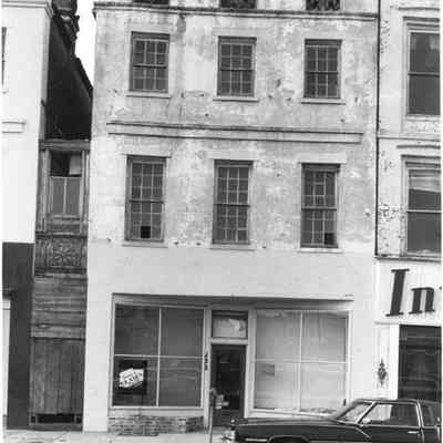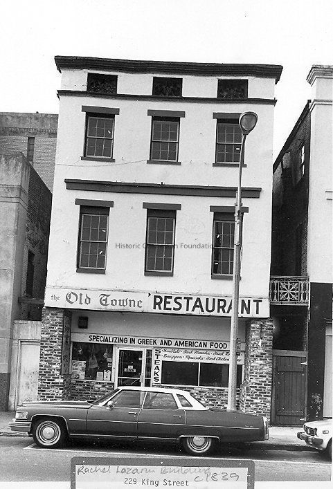 Constructed ca. 1839; various rehabilitations late 1980s. Rachel Florence Lazurus, one of a number of "sole traders" (women permitted by South Carolina equity courts to operate businesses separate from their husbands) first acquired this status in 1804 and entered the dry goods business in 1817. A woman of great strength and talent, she was the only female subscriber to the Hebrew Harmonic Society, a group that provided the funds for the installation of an organ in the rebuilt Beth Elohim Synagogue in 1841, and she bore 17 children. After the fire of 1838, Mrs. Lazurus received one of the loans under the Act for the Rebuilding of the City of Charleston and used the funds to construct these 3 buildings as tenements. Although the storefronts have been altered over the years, the 3-story stuccoed brick facades retain their original fenestration with stone lintels and sills, as well as masonry belt courses, and molded cornices. On the upper stories each structure follows the Charleston single house plan and most retain their Greek Revival mantels and staircases. Between the buildings, hyphen infills feature cast-iron panels boasting circular devices also with anthemion motifs. Cabinetmakers Martin Vogel and Francis Salvo completed a similar building of four bays next door at 235 King Street with thistle motifs in its parapet grilles. (Poston, Buildings of Charleston.)