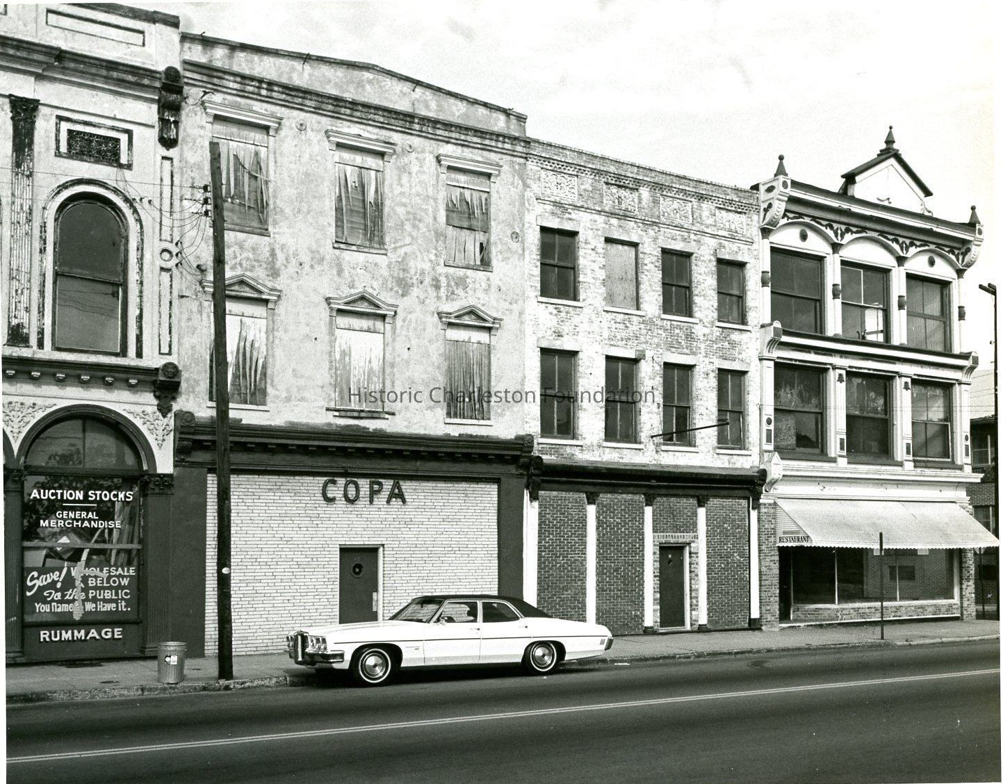 B&W photograph of 229 Meeting (Palmetto Railroad Salvage), 231 Meeting (Copa), 233 Meeting, and 235 Meeting, east (front) elevation. Car parked in front of the buildings.Collection