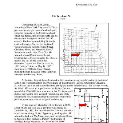 Constructed ca. 1915. On October 23, 1888, John L. Macauley of New York City purchased about eight acres of undeveloped, suburban property on the Charleston Neck which had belonged to Tucker North and his descendants throughout most of the 19th century. The land spanned King Street to Rutledge Avenue and would eventually include Francis Street, Cleveland Street, and Maverick Street. On April 10, 1893, Macauley hired a real estate broker to market and sell off the land, and on April 14, 1893, a plat was filed showing over 100 lots, one of which was Lot 53, the eventual location of 23 Cleveland Street, an American foursquare, two-story house with a one-story front porch.