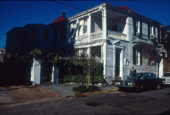 Color slide of 23 King Street, taken Jan. 1, 1990. East (front) elevation, corner view of house. Hurricane Hugo Damage Assessment photograph.Collection
