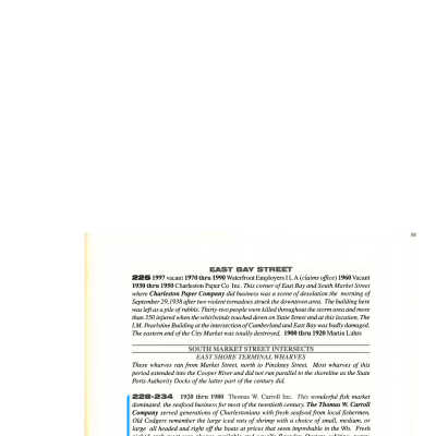 Constructed 1906-10; rehabilitated 1984. Thomas W. Carroll, the son of an English immigrant stevedore, established an icehouse and fish business on this site in 1895. When his ice concern was purchased by Southern Ice Company, he continued to sell fish at the same location. The present brick structure just north of the corner, with arched windows and simple brick banding, was built by Carroll between 1906 and 1910. Wooden buildings on the corner were torn down for parking in the 1970s, and after the Carroll family closed the company in 1984, this street front site was developed with a modern office building connected to the earlier structure. (Poston, Buildings of Charleston.)