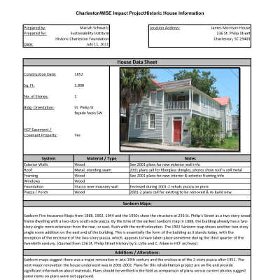 Two files contain legal documentation of the covenant on the property; correspondence and other documentation related to the sale of the property; documentation related to the management of the property; documenataion of HCF's acquisition, rehabilitation, and preparation for the sale of the property; historical and chain-of-title research including plats, maps, and deeds; newspaper articles; architectural drawing of front elevation (undated, unattributed); data sheet for CharlestonWISE Impact Project (Sustainability Institute) that includes construction date, square footage, number of stories, building orientation, system materials/types, Sanborn Map research notes, and additions/alterations notes (Mariah Schwartz, 2011).