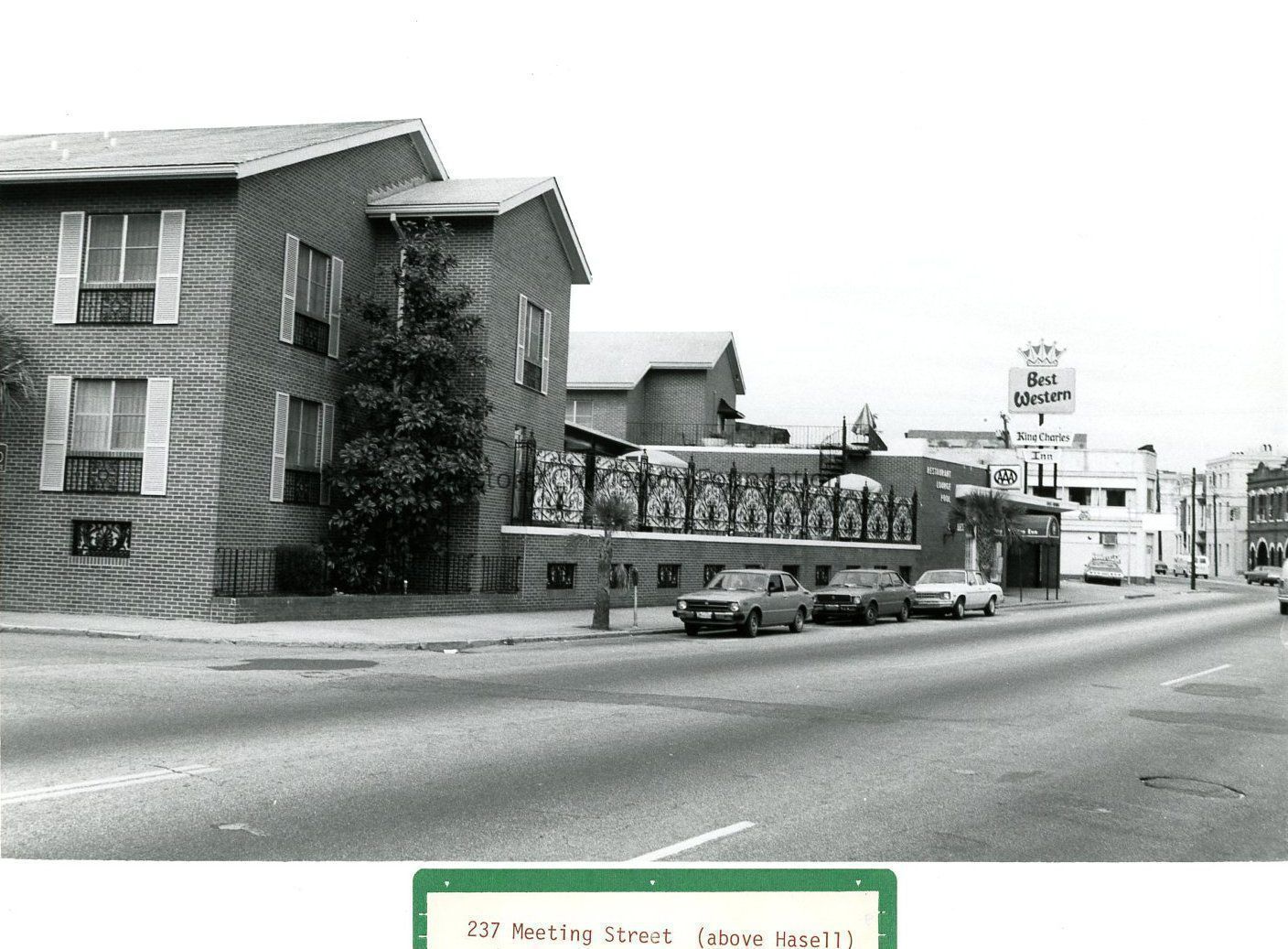 a: View looking north on Meeting Street from the corner of Meeting and Hasell Streets. The Best Western King Charles Hotel (237 Meeting) is in foreground. Buildings leading to Wentworth Street at right.