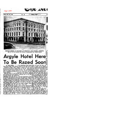 File contains captioned newspaper photographs of building in 1895 and 1985; brochure for King Charles Inn, ca. 1960s; newspaper articles about demolition of Argyle Hotel (pdf).Collection