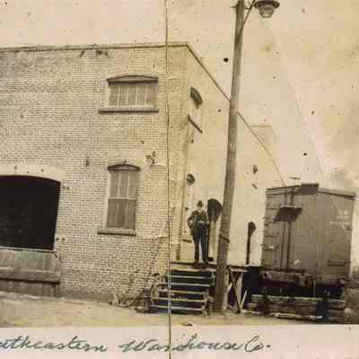 b: Southeastern Warehouse Company building, which was located at the either the northeast corner of Washington and Charlotte Streets (see newspaper advertisements from the 1920s) or the northwest corner of Washington and Hasell Streets. Man stands at the top of the steps of the train platform.Collection