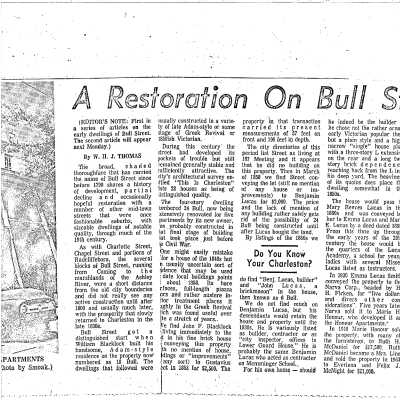 Constructed ca. 1858; rehabilitated 1969. Benjamin Lucas, a builder or contractor who also served as city building inspector in the 1860s, bought this lot in 1858 five years after it was carved out of the Blacklock property. Constructed in the plantation style version of the Charleston single-house plan with double-tiered piazzas facing the street, this 3½ story stuccoed house has fine mid-19th century decoration with stone window lintels and sills and corner quoining. The house passed to female members of the Lucas family in the 1880s and served for more than 40 years as the Lucas Academy, a school for young ladies. The sisters probably added the substantial rear addition at this time. For much of the 20th century the house deteriorated in its use as eleven apartments. A 1969 restoration by Richard Jenrette, of New York and Charleston, converted it into five units. (Poston, Buildings of Charleston.)