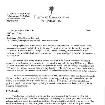 Files contain documentation of the easement on the property including related correspondence and Confirmation of Understanding; Part I certification (National Register); annual inspection reports, requests for alterations, and correspondence related to the management of the property; renovation plans (various dates); FOHG house histories (1999, 2003, 2015); brief history of 24 Church Street entitled "A Federal House in Charleston" by Brockington and Associates, 2001); historical/chain-of-title research information including copies of deeds, plats, Sanborn Maps.