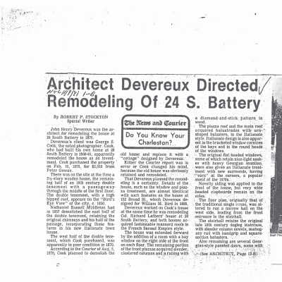 Buildings of Charleston (see Abstract), pg. 270 (entry for 22 South Battery)Created By