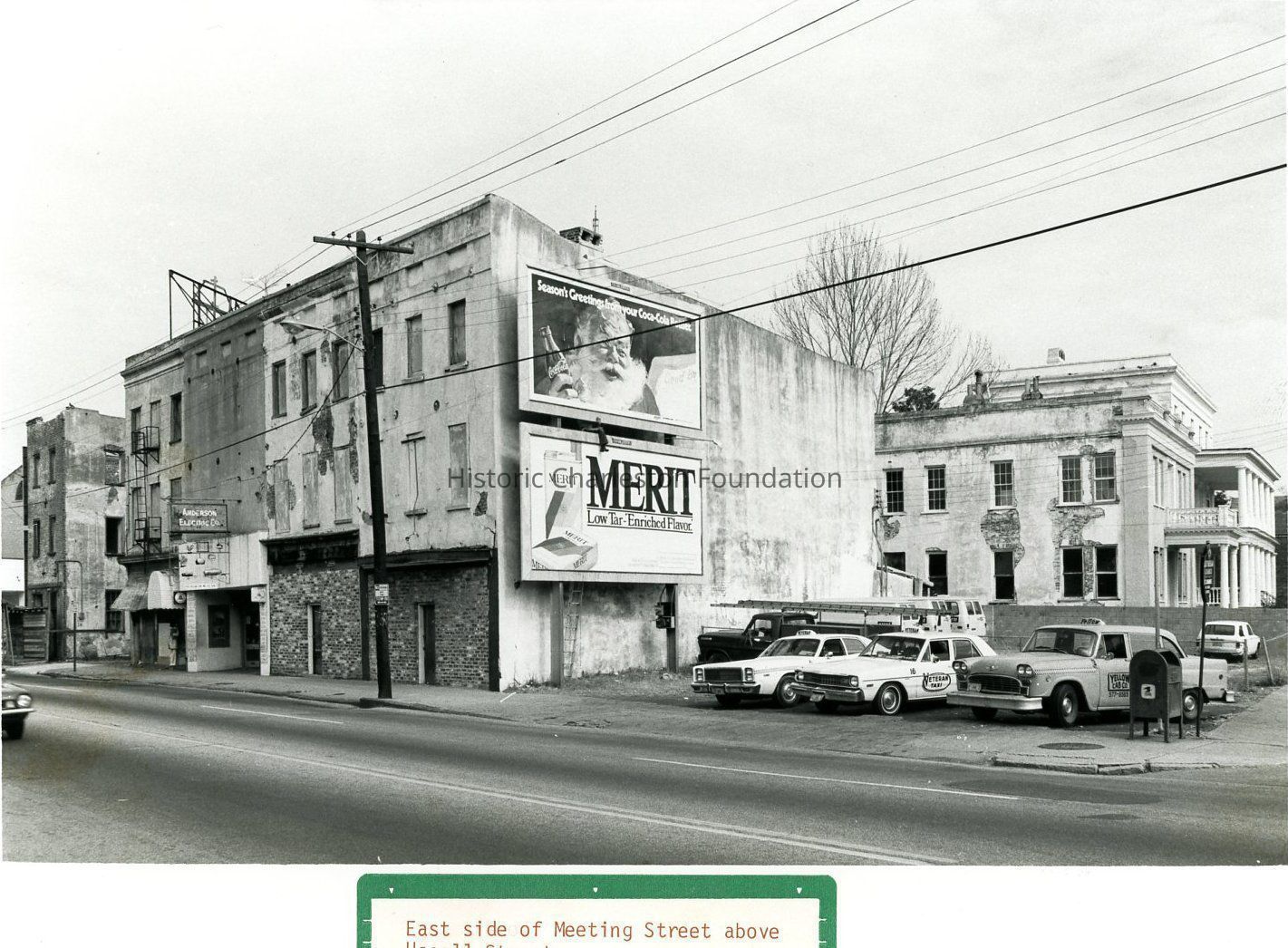 B&W photograph of the east side of the 240 block of Meeting Street, from a parking lot at the corner of Meeting and Hasell Streets and showing 246 Meeting Street (Anderson Electric Co.). 248 Meeting, 250 Meeting, and 252 Meeting. Southwest elevations of 66 Hasell Street and 64 Hasell Street visible at right. 246-250 Meeting is currently a parking lot.