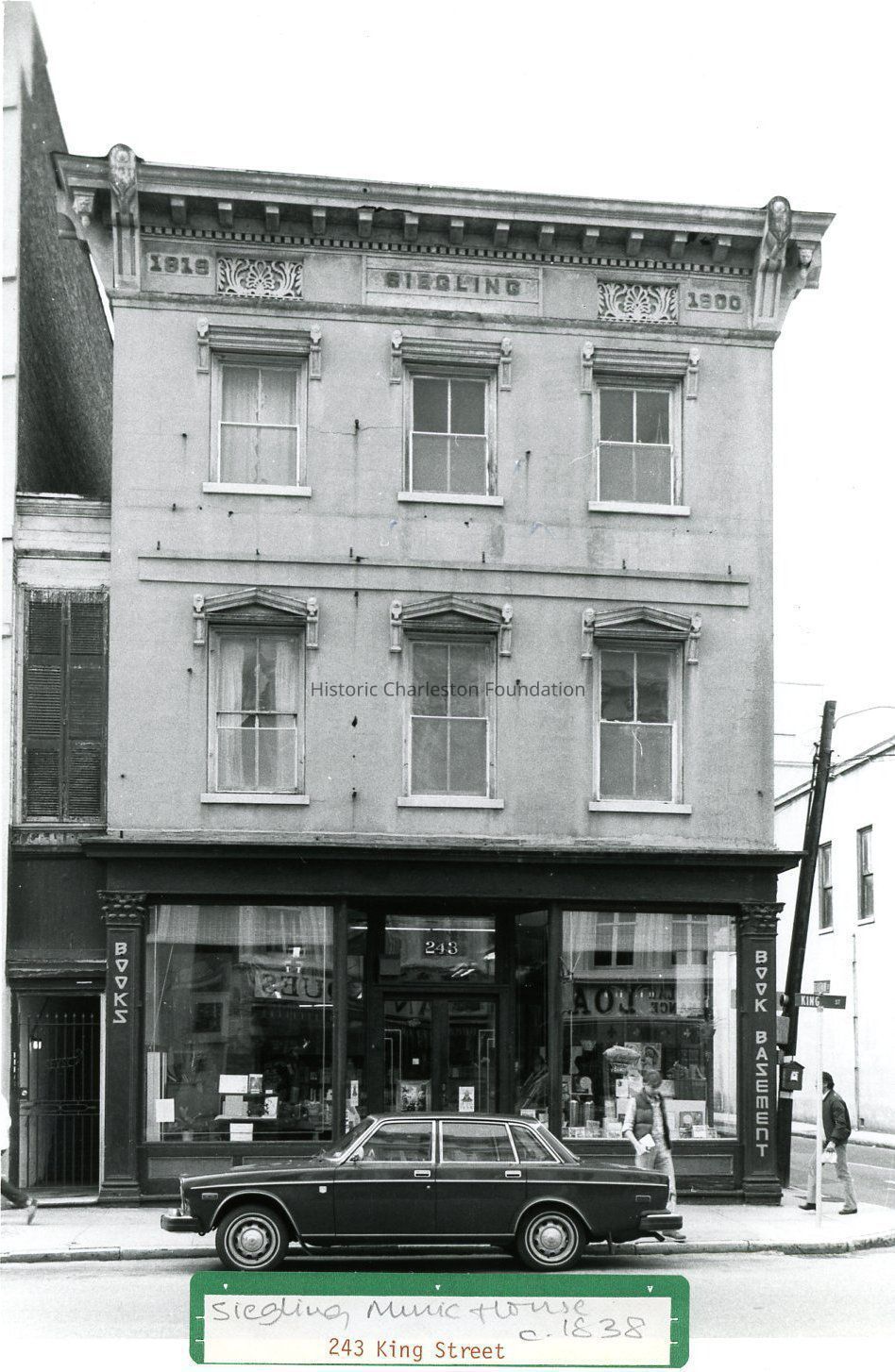 B&W photograph of 243 (Siegling Music House), showing the corner of King Street and Beaufain Street. Signage on building for "Books" and "Book Basement." Car parked in front of building. Two pedestrians on sidewalk.