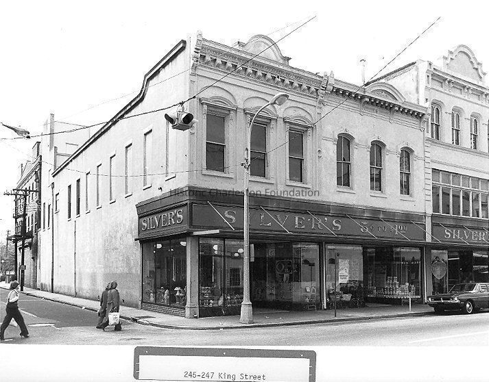 B&W photograph of 245-247 King Street, street (front) elevation, showing the northwest corner of King Street and Beaufain Street. Silver's 5 & 10 & 1.00 Store. Pedestrians in the street and car parked in front of building.