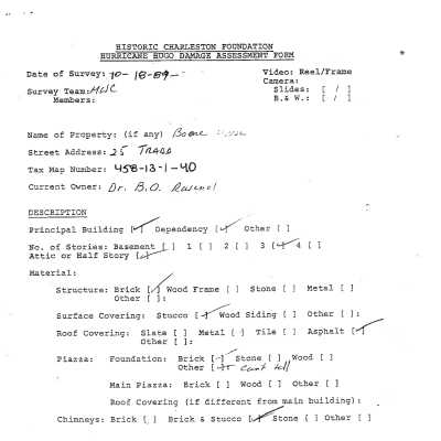 File contains graduate student report on the history of the house, which includes historical and chain-of-title research, maps, photos, and other supporting documentation (Hillary King, 2006); FOHG house history (2005); FOHG garden history (1992); house history from Information for Guides of Historic Charleston (1984); Rosen and Associates (engineers) inspection report (2003); 1886 earthquake damage assessment; Hurricane Hugo damage assessment.Collection