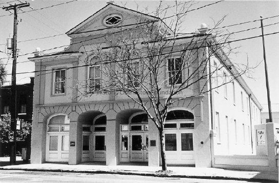 Constructed ca. 1838; rehabilitated with reconstructed facade, 1985. The rehabilitation of this building is a testament to Charleston's preservationist perseverance, to the community spirit of local business leaders, and to the tax advantages of historic preservation in the 1980s. Built by a coach and carriage maker with loan funds following the disastrous Ansonborough fire of 1838, the structure had one of the most distinctive facades in the city, incorporating Classical and Greek Revival elements with hints of the later Italianate style. The site remained in the hands of successor carriage makers until 1898, later becoming a bottling plant and a wholesale shoe company. The Gayer Building's most ignominious period came after the property's sale to the Tire Company: Tthe elegant facade was removed and a driveway added to the front. After being abandoned by the 1950s and acquired by the neighboring church for parking, the Board of Architectural Review denied demolition requests on three occasions. In 1985 the front facade was reconstructed based on an early photograph and became the headquarters of the bank that occupies the site. (Poston: Buildings of Charleston.)