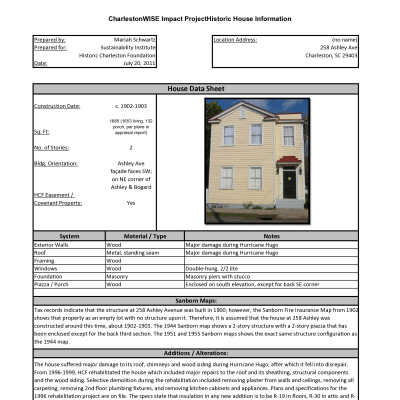 Four files contain documentation and related correspondence related to the covenant; documentation related to the purchase of the property and rehabilitation work needed; correspondence related to the sale of the property; annual inspection reports; correspondence and other documentation related to the repairs and renovation of the house including by the owner and HCF, e.g., Agreement, Specifications (N.I.I.), Scope of Work, etc.; chain-of-title records and research notes; photocopies of 1942 Sanborn map and 1996 plat; captioned newspaper photograph showing Crafts Training Program participant; data sheet for CharlestonWISE Impact Project (Sustainability Institute) that includes construction date, square footage, number of stories, building orientation, system materials/types, Sanborn Map research notes, and additions/alterations notes (Mariah Schwartz, 2011); SC Dept. of Archives and History architectural survey form; Neighborhood Impact Initiative memorandum (Houlihan, 1998) and property description.