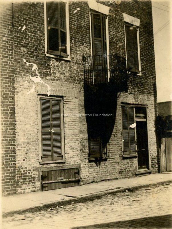 B&W photograph of 26 Tradd Street (Robert Ewing House), street (front) elevation. Features the first and second stories and the second story iron balcony.
