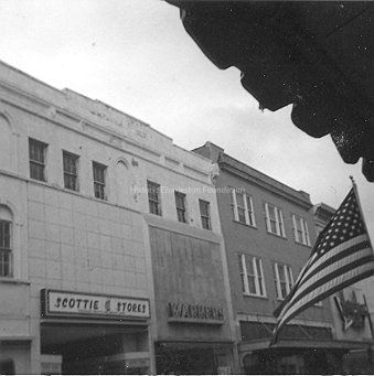 B&W photograph of 265-267 King Street, east (front) elevation. Occupied by Scottie Stores and Warners. View from mid-first-floor to the tops of the buildings.Collection