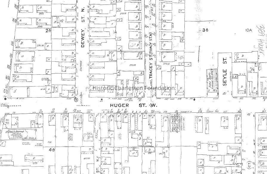 File contains plat of 387 Huger Street (2002); preliminary plans (elevations) for 389 Huger Street (2005); City of Charleston parcel map of 370-403 Huger Street; Sanborn Map (presumably 1902-Apr. 1944 map) showing 357-403 Huger Street; occupancy history of 268-399 Huger Street from Old Codgers' Charleston Address Book.