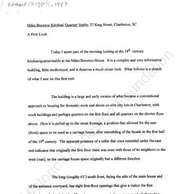 File contains house history from The Vernacular Architecture of Charleston and the Lowcountry; FOHG house history (1992); architectural description and house history (Edward A. Chappell, 1985); house history from Information for Guides of Historic Charleston; report "Miles Brewton's Land: A History, 1694-1990" by Richard N. Cote; architectural description of the kitchen, quarter, and stable by Edward Chappell (1997); newspaper article; article from The Magazine Antiques (1993); measured floor plans (unattributed, undated); photocopies of some late 1800s/early 1900s Titles (some almost illegible); photocopy of transcribed Will of Miles Brewton; garden information and plans (copied from publications).