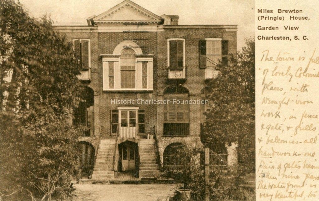 Constructed ca. 1769; altered ca. 1820s, 1840s; restored 1988-92. Richard Moncrieff, contractor; Ezra Waite, John Lord, Thomas Woodin, and others, woodworkers. This house is considered the finest double-pile house in Charleston and with its outbuildings constitutes the most complete Georgian townhouse complex surviving in America. Miles Brewton, a wealthy slave trader and merchant, inherited the land on which the house was built from his prosperous grandfather and father. Although Ezra Waite claimed correctly to have performed much of the interior carving, recent research has indicated the hands of at least two others in the upstairs drawing (dining) room, including John Lord and Thomas Woodin, master carvers who had emigrated to Charleston from London. Much has been made in recent years of the use of pattern books in the design of the house and of the carving of the woodwork on the exterior and interior. In 1773 Josiah Quincy of Boston visited Miles Brewton and wrote enthusiastically in his diary: "Dined with considerable company at Miles Brewton, Esqr's a gentleman of very large fortune: a most superb house said to have cost him 8,000L sterling. The grandest hall I ever beheld, azure blue satin window curtains, rich blue paper with gilt, mashee [sic] borders, most elegant pictures, excessive grand and costly looking glasses, etc." A major new restoration of the building was completed in the 1990s. The original line of outbuildings on the northern edge of the property is relatively intact. The first portion consists of a kitchen, laundry, and carriage house built in 1769. The facade of the carriage house was remodeled by the Pringles (in Gothic Revival style) in the 1840s. Immediately behind the kitchen lies the cistern and an arcade with stables and storerooms leading to a substantial brick, 2-story structure containing slave quarters and dating from about 1820. Another arcade stretches west from the quarters to an 18th century building used originally as either a dairy, privy, or garden folly. These outbuildings relate exclusively to a paved courtyard and the cellar of the house and are separated from the garden by a brick coping and wooden fence. (Poston, Buildings of Charleston.)