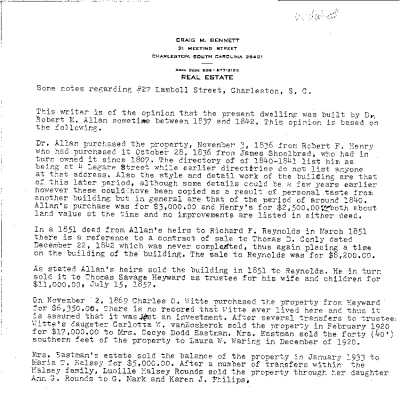 File contains house history (HCF, undated); house history (Craig M. Bennett, undated); chain-of-title/historical research notes (undated, unattributed); plat (practically illegible); 1997 plat; photocopy of set of architectural drawings (elevations and floor plans presumably as-built but with notation that BAR application was deferred in 1995); Preservation Consultants "History of 27 Lamboll and the Gate for the Proposed Addition," with accompanying photos; Rosen and Associates inspection report (2006); excerpt from Vernacular Architecture of Charleston & the Lowcountry.Collection