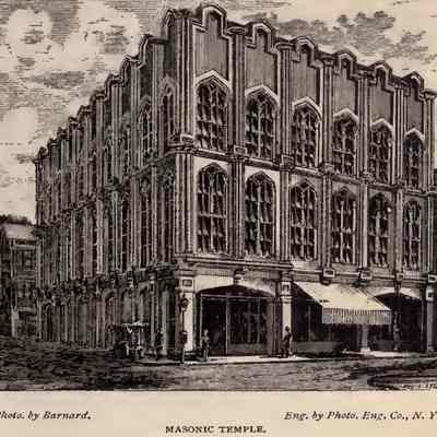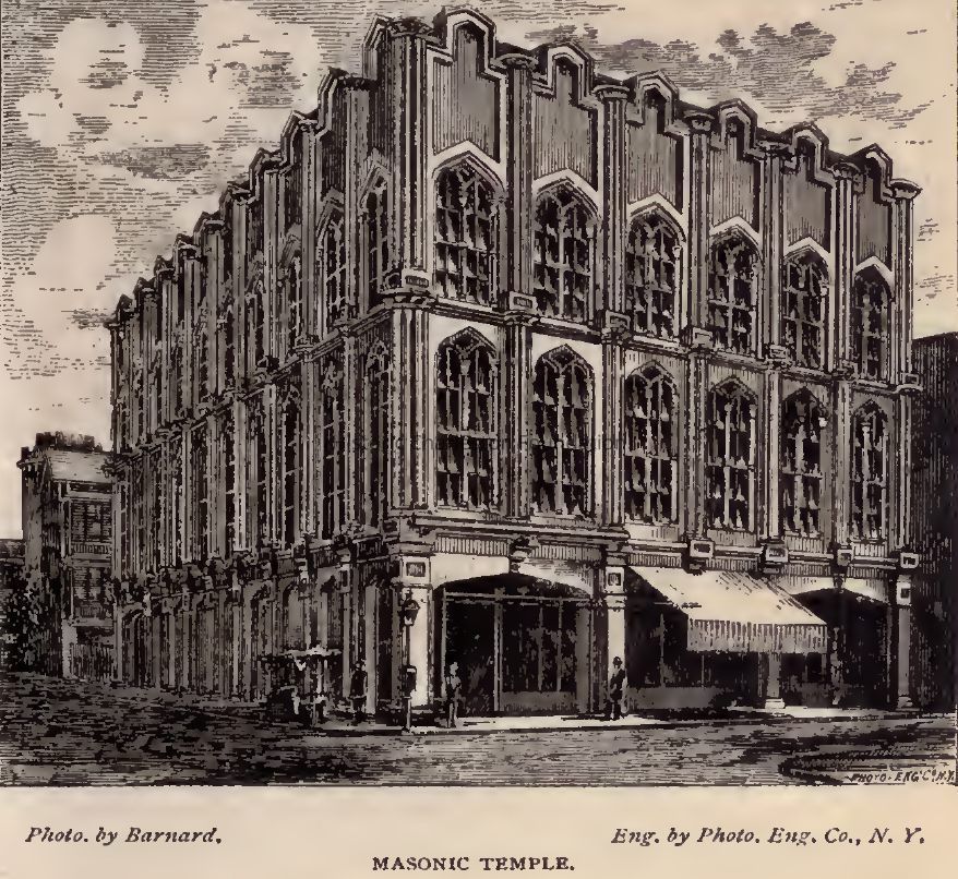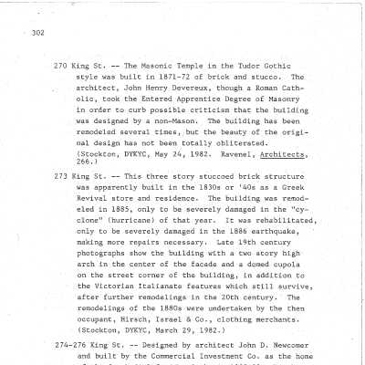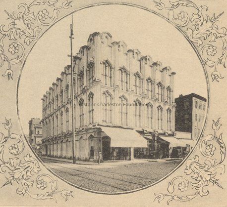 Constructed 1871-72; partially rehabilitated 1984. John Henry Devereaux, architect. The Grand Lodge of Ancient Free Masons of South Carolina laid the cornerstone for this building in 1871. When completed, the 3-story Gothic Revival style structure had 3 stories facing King Street and a stair hall entry on Wentworth Street that rose to a grand lodge room with a 40-foot coved ceiling studded with 5 gas chandeliers. Alterations through various renovations in 1877, 1885, 1886, and 1895 and extensive remodeling in 1920 and again in the late-1940s led to the loss of much of the original character of this monumental edifice. In 1984 the ground story, Gothic-arched storefronts were restored, but the infill in the upper stories and the modern awning windows remained until ca. 2008, when additional renovations were to create commercial-residential uses for the building. (Poston, Buildings of Charleston.)