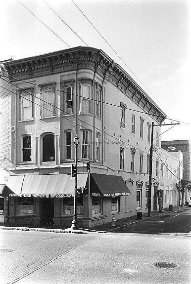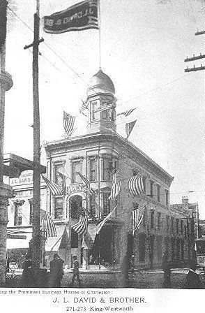 Constructed ca. 1840; rehabilitated 1987-88. Long considered to be one of Charleston's most commanding corner commercial structures, this building was begun as early as the 1830s when it was owned by Daniel Parish and stood as a 3-story, square-ended store and dwelling. Owned in the 1850s by the Charleston real estate magnate Etienne Poincignon, the building passed through his descendants, the McNulty and the Storen families, until the 1980s. For much of the late-19th century the property was rented to the Hirsch Israel Company, a clothing store. This company renovated the building with a multi-story central arch and a domed corner tower. The tower was later removed and the arch was infilled, but evidence of the pressed-metal Italianate cornice and the elaborate window lintels supported by console brackets partially survives. The lintels and certain other features were restored in the late-1980s.