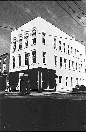 B&W photograph of the Commercial Savings Bank Building (274-276 King Street), corner view of the building showing the west (front) and south elevations. Also shows the northeast street corner of King and Wentworth Streets.