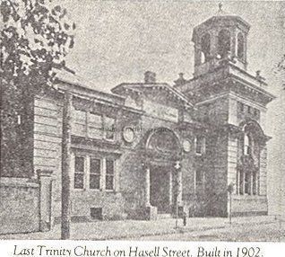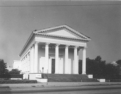 Constructed 1848-50. Edward C. Jones, architect. Perhaps the least altered of Charleston's late-Greek Revival church buildings, Trinity was actually constructed for the Third (later Westminster) Presbyterian Church. Often compared to the Church of the Madeleine in Paris and its predecessor the Mason Carré at Nimes, primarily due to its monumental Corinthian-columned portico and massive dual flight of stone steps, the building nonetheless reflects its region with its large winding and contemporary technology with its cast column capitals. Inside the church's louvered shutters over the tall windoews, open galleries, and central apse, decorated with molded plaster anthemions and other embellishments and flanked by four Corinthian columns, portends the end of the simplicity of the Greek and the emergence of the Roman Revival and the more elaborate styles of the late antebellum period. In 1926 the Trinity Methodist congregation, sited at Hasell Street and Maiden Lane since 1792, purchased the building when Westminster Presbyterian Church moved to an uptown location. The Trinity congregation brought with them a large Tiffany window donated in memory of George Walton Williams, builder of the Calhoun Mansion, installing it in an existing chapel at the southwest end of the church.