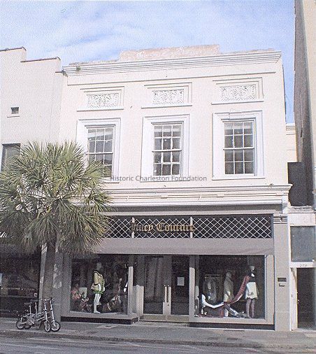 Located on the east side of King Street, 2 doors north of Wentworth Street, this is a 2-story, rectangular brick building covered in beige stucco. Constructed ca. 1829 in the Greek Revival style. On the 1st floor, 2 Doric pilasters frame a restored storefront with awning, recently altered in 2004 and 2008. On the 2nd floor are 3 regularly spaced, 6-over-6 double-hung sash windows. Directly above the 2nd floor windows are three regularly spaced niches filled with decorative wrought iron grilles displaying honeysuckle palmetto motifs. The parapet is decorated with a simple cornice and hides the actual roof from view.